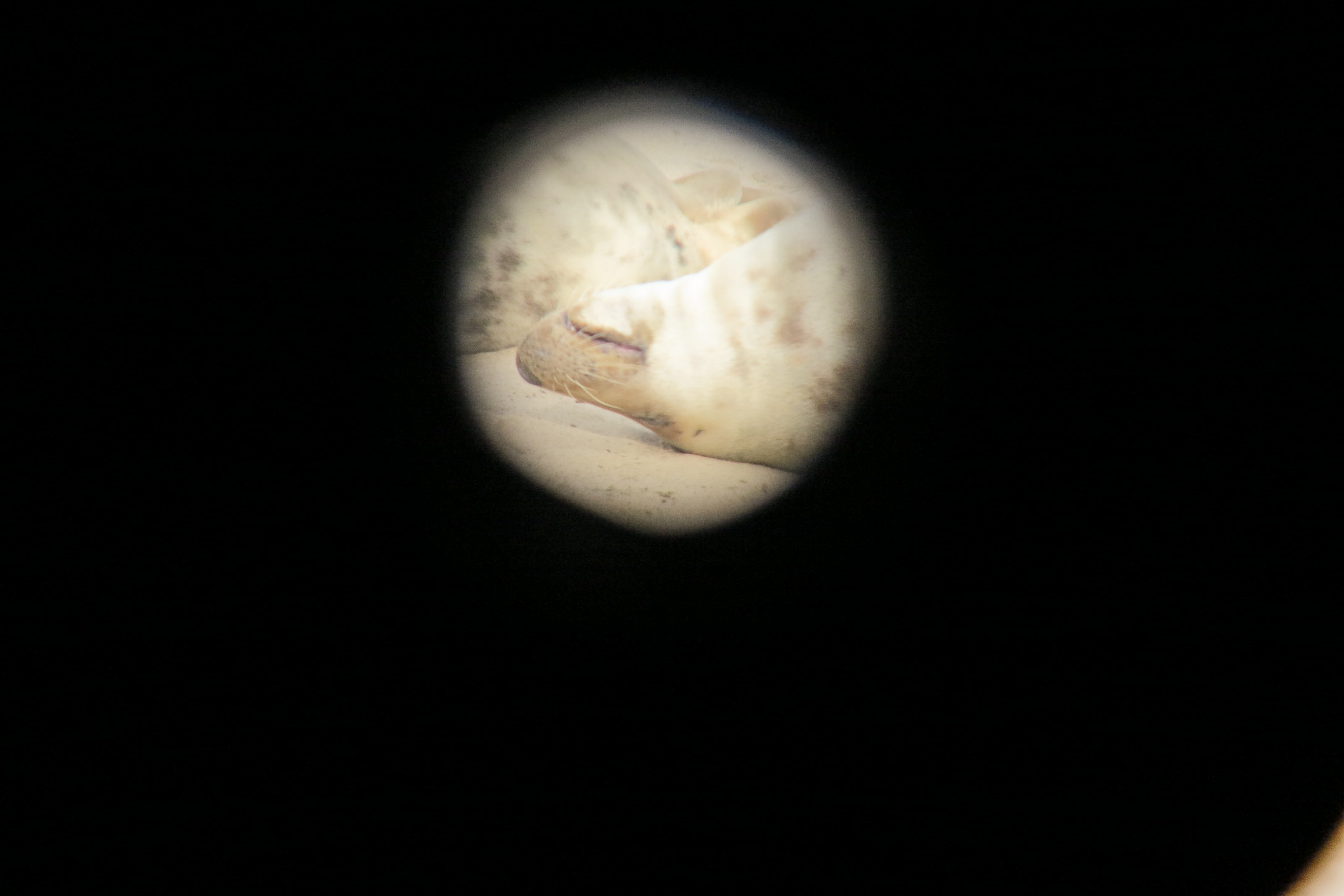 Napping seal seen, binoculars zoom-lens, oh I wish to snore