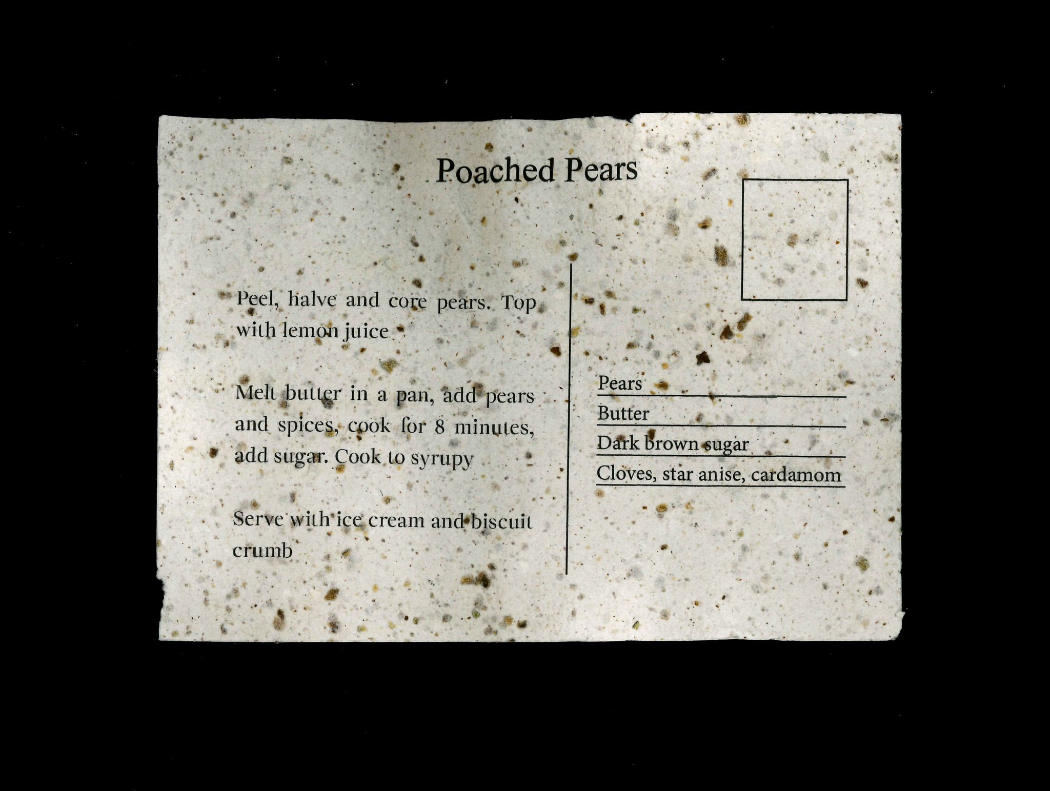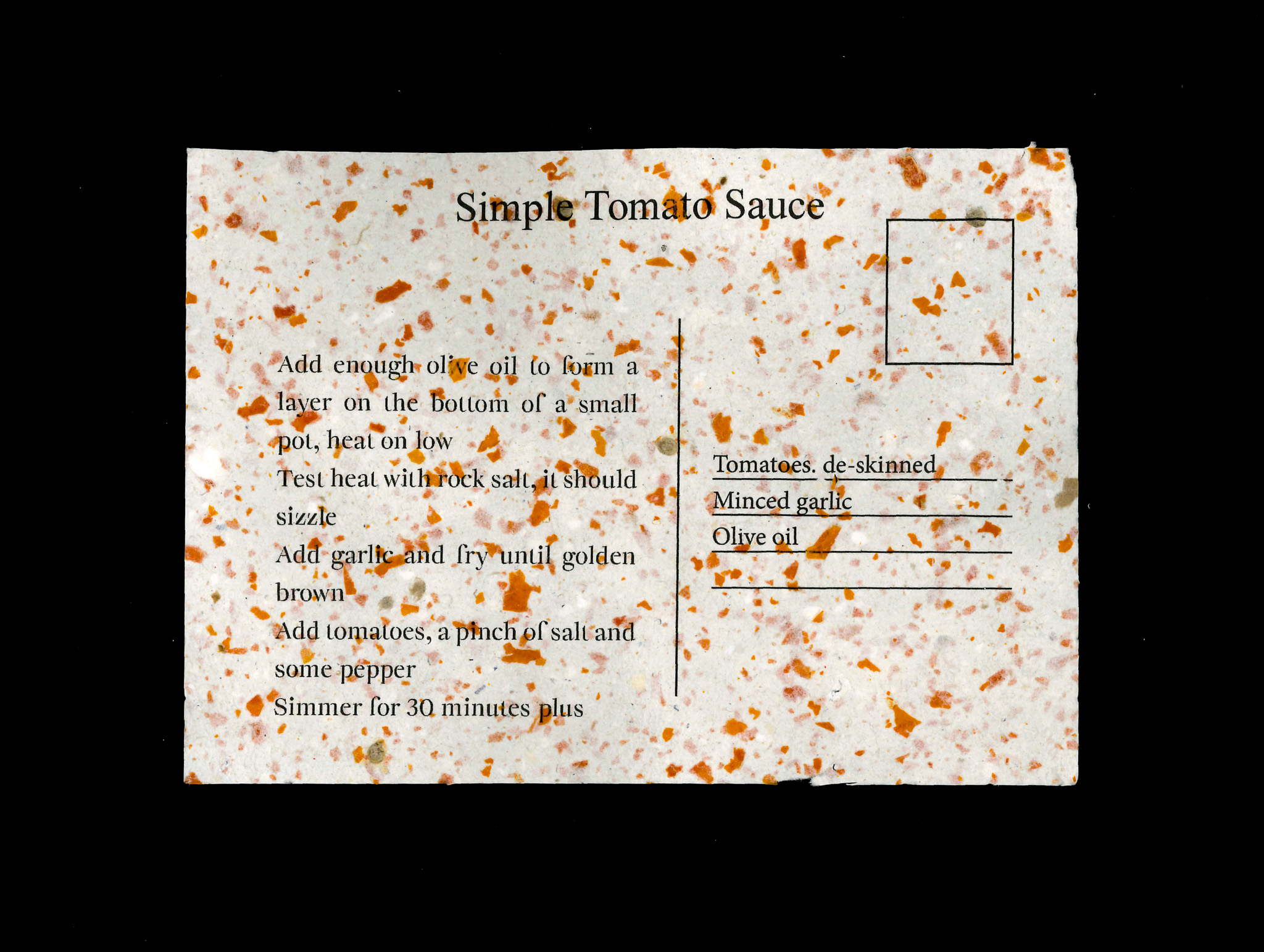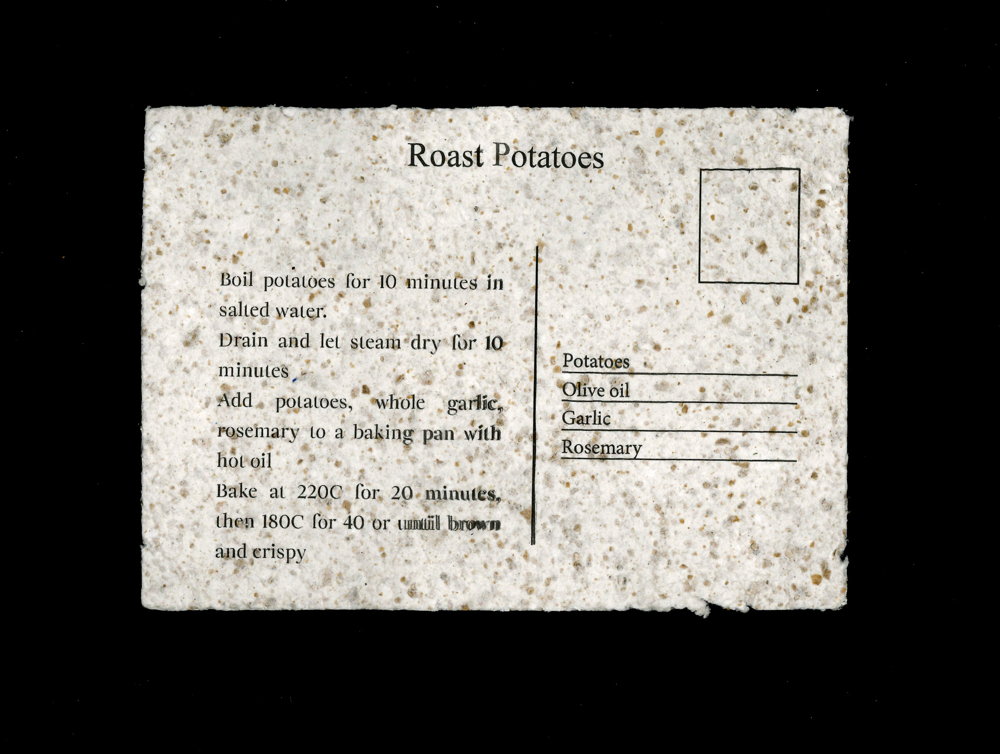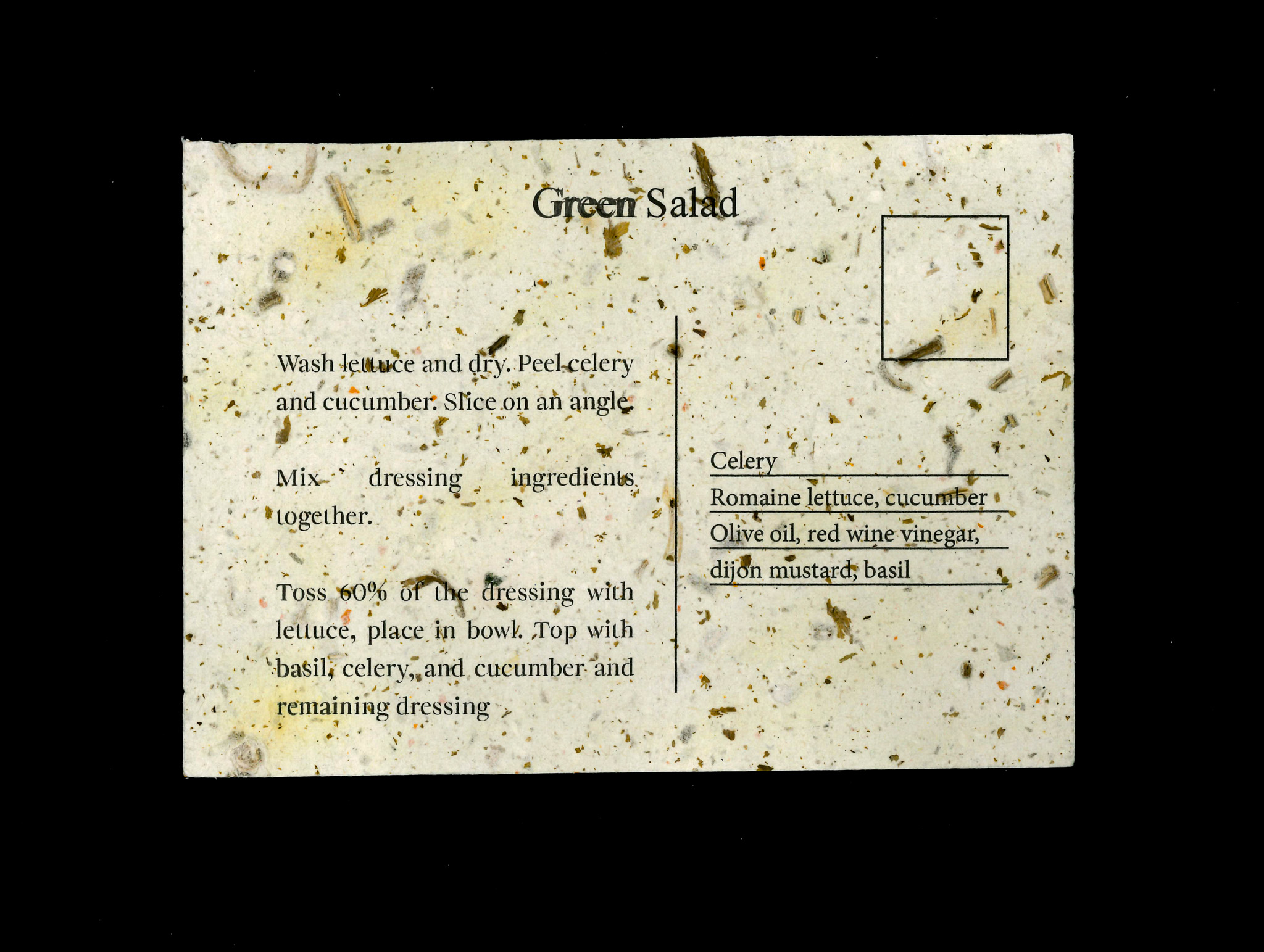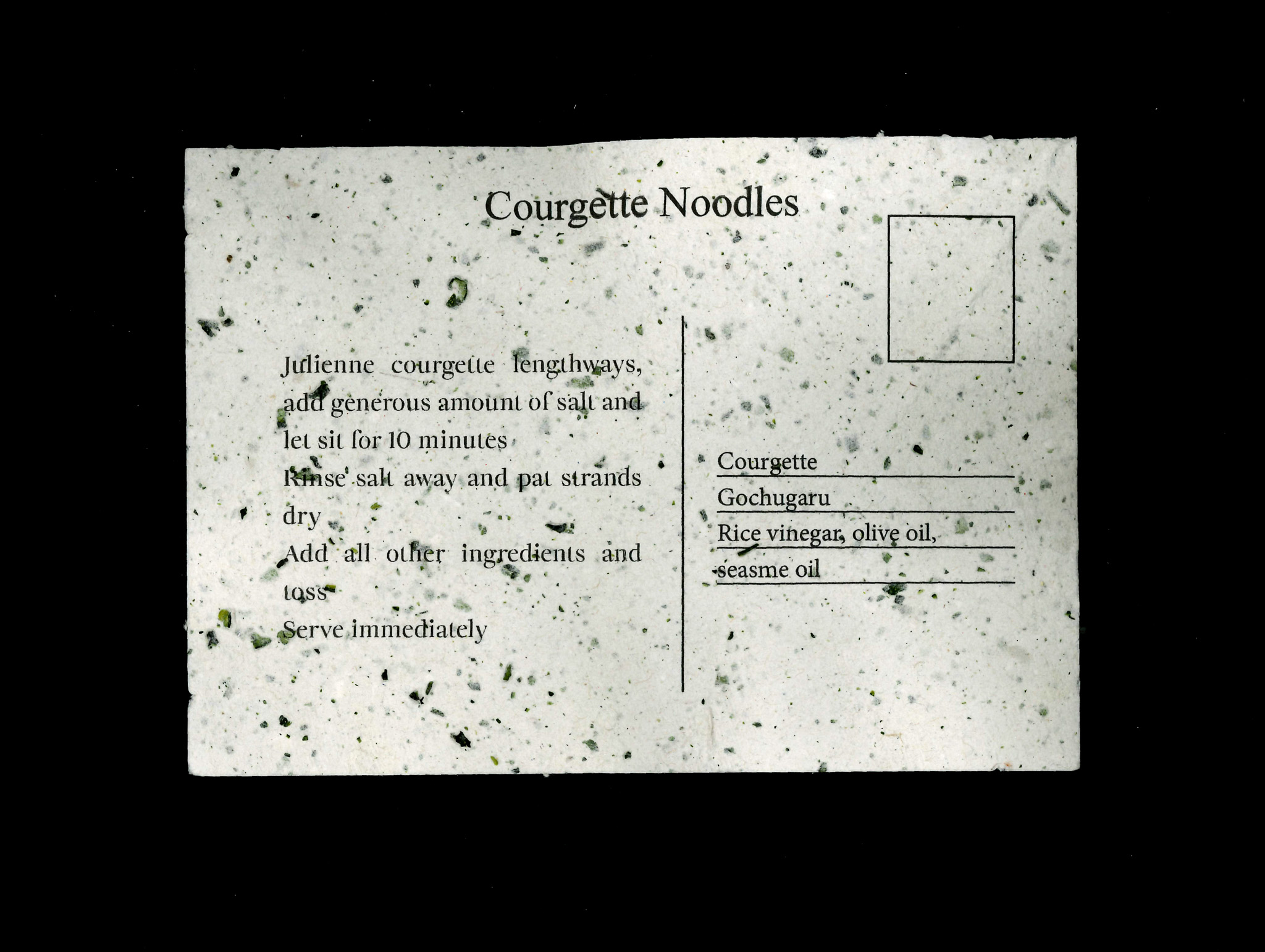 For when you can’t show someone how to make a dish where you must measure with your fingers and eyeball the sauces. Made with the main ingredient of each dish and a little love. These postcard recipes were created using the food waste from a summer of feasts, banquets, and gatherings.