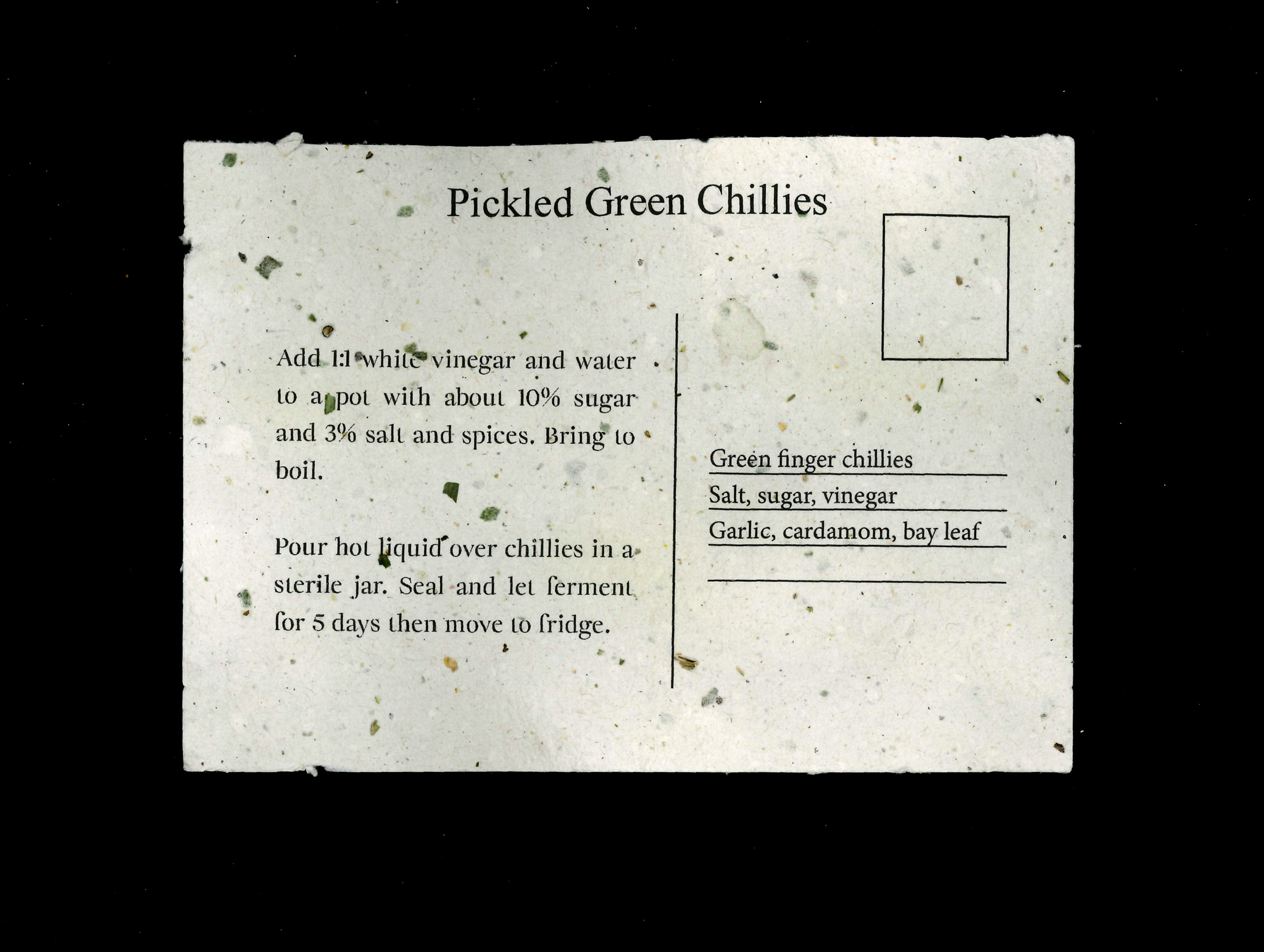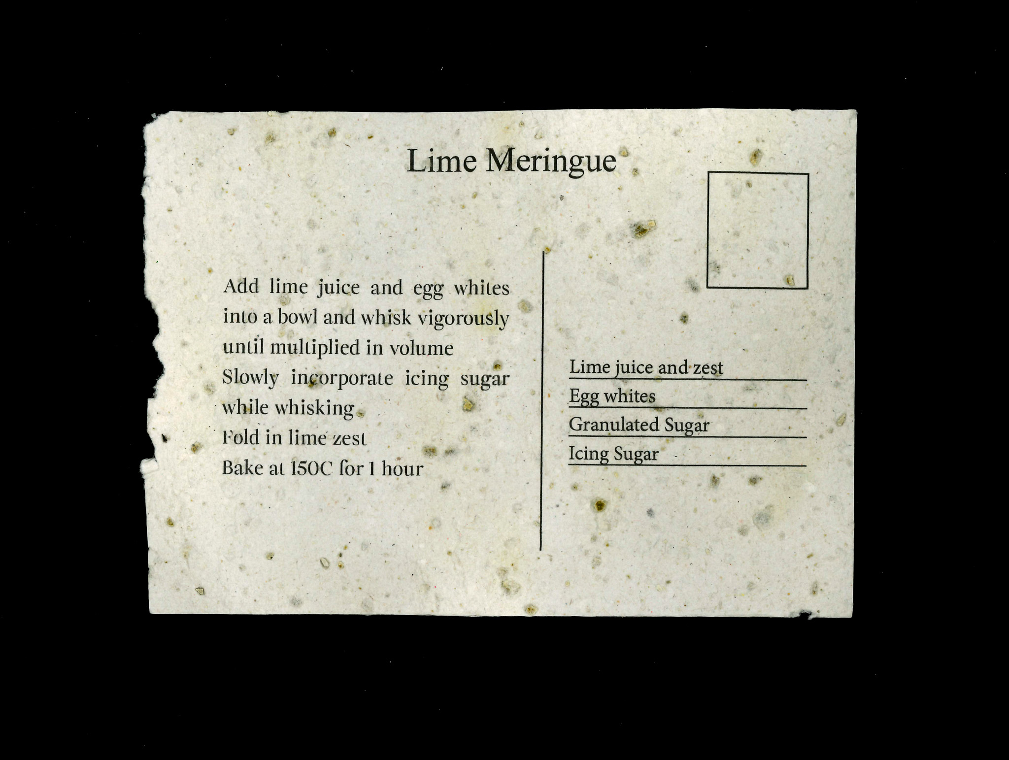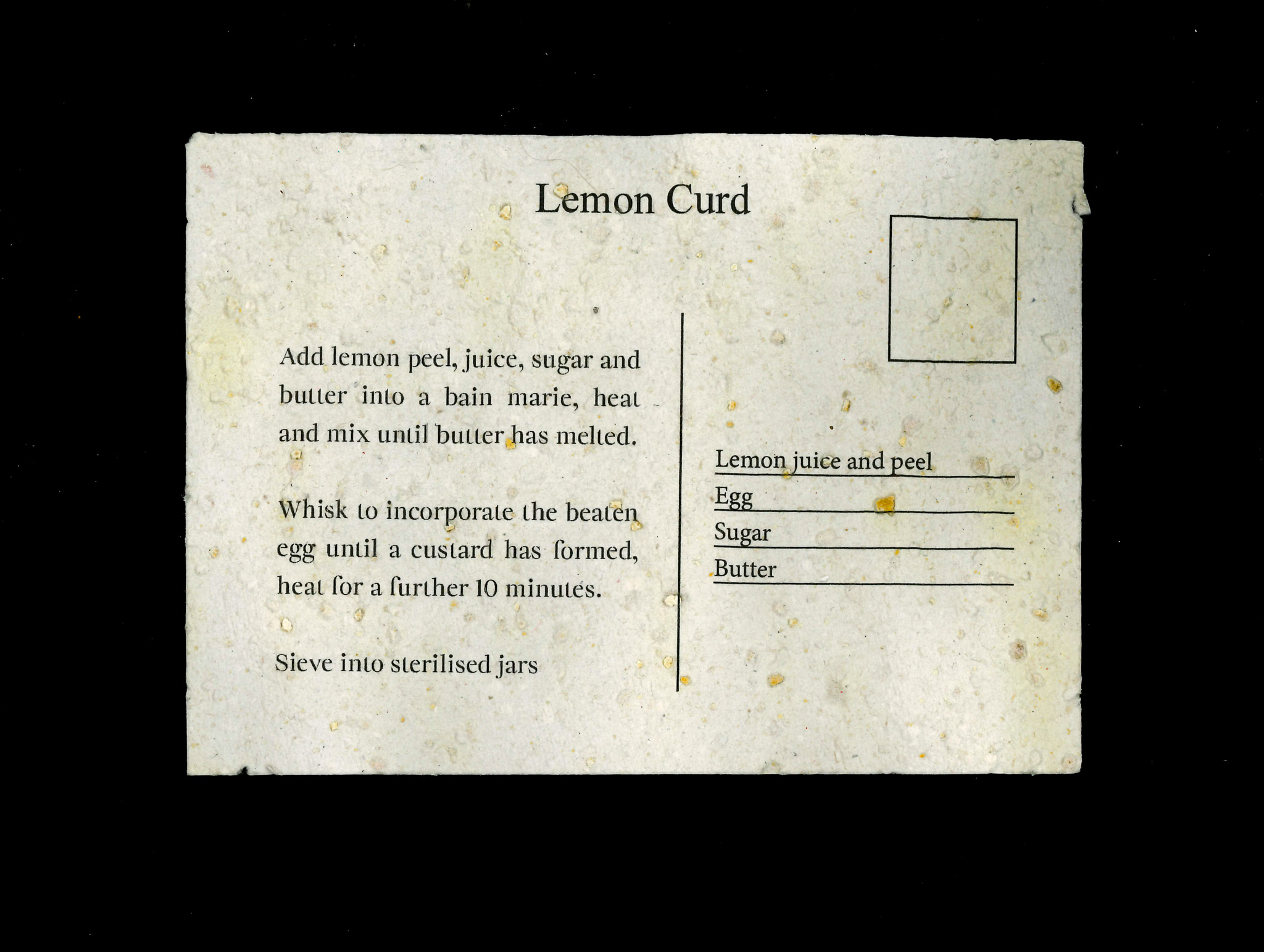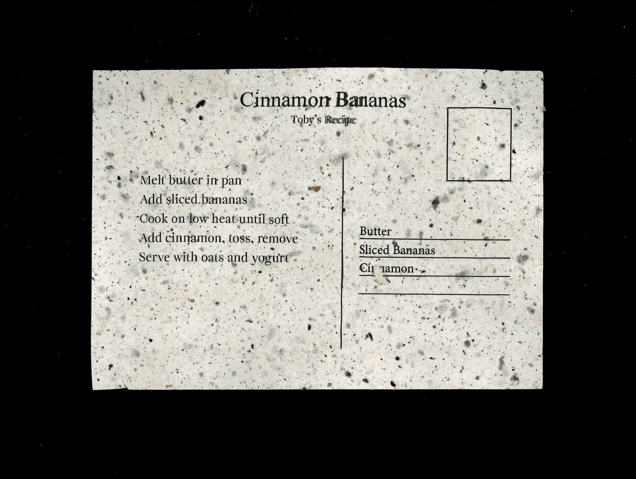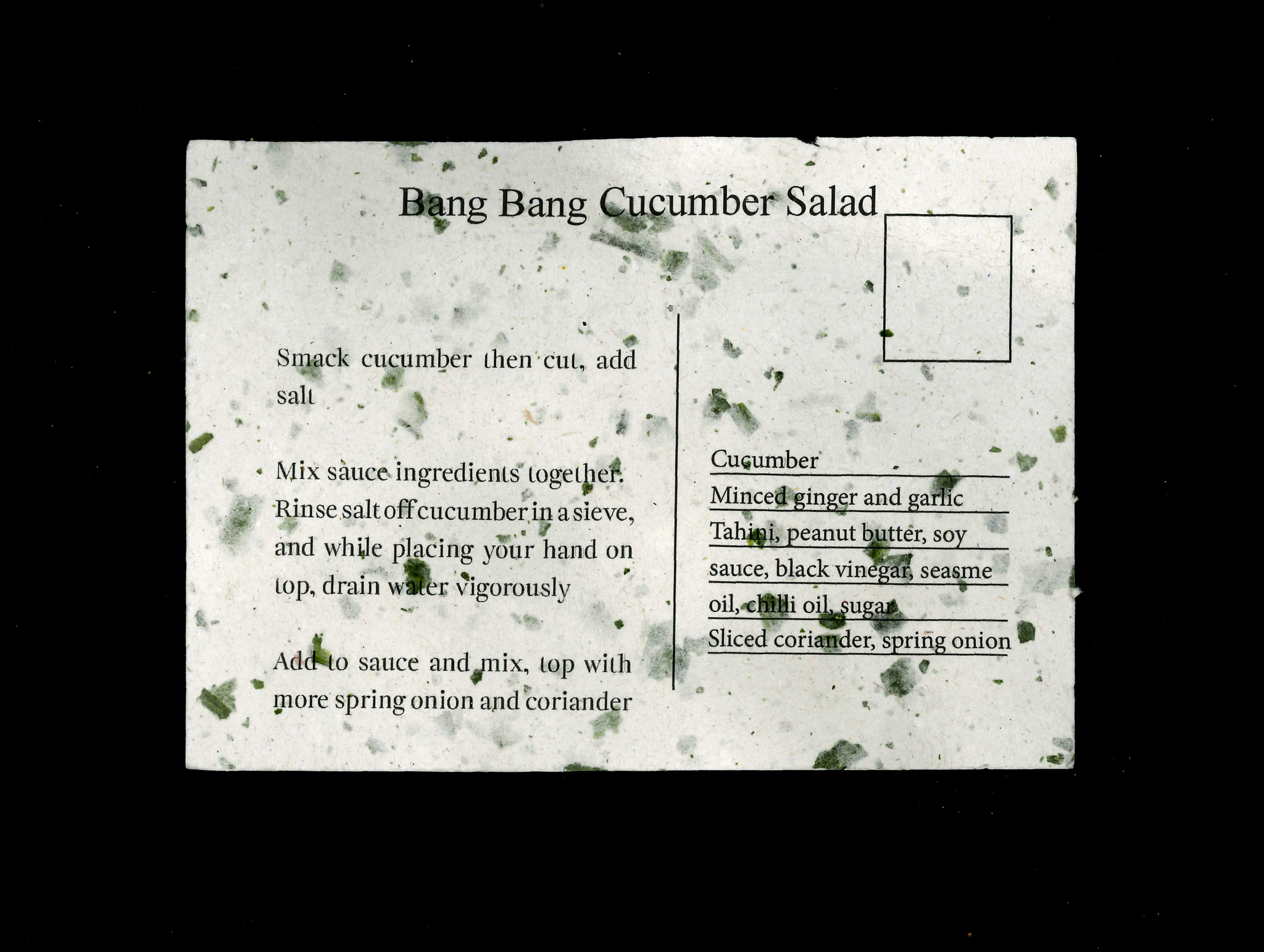 For when you can’t show someone how to make a dish where you must measure with your fingers and eyeball the sauces. Made with the main ingredient of each dish and a little love. These postcard recipes were created using the food waste from a summer of feasts, banquets, and gatherings.