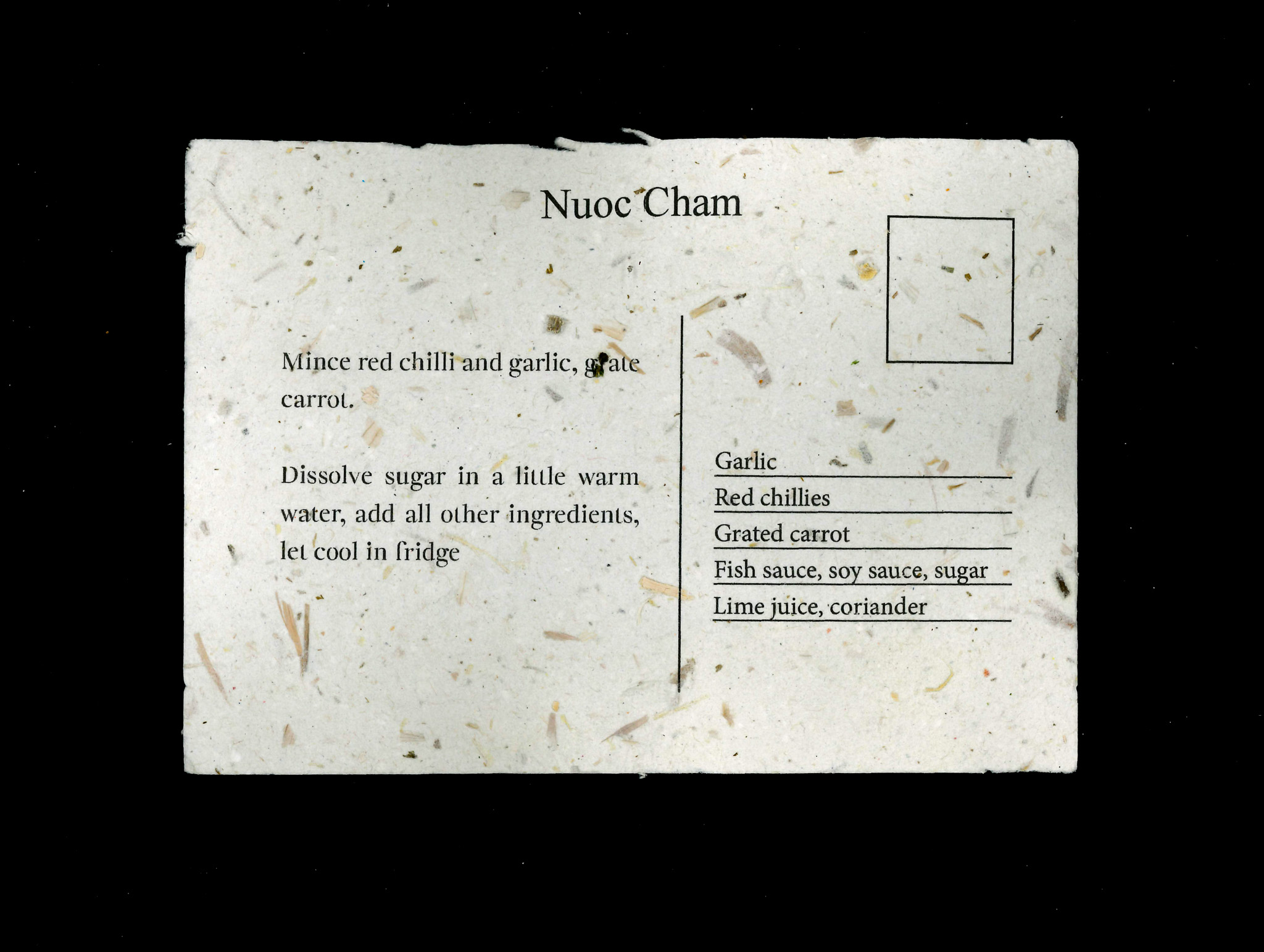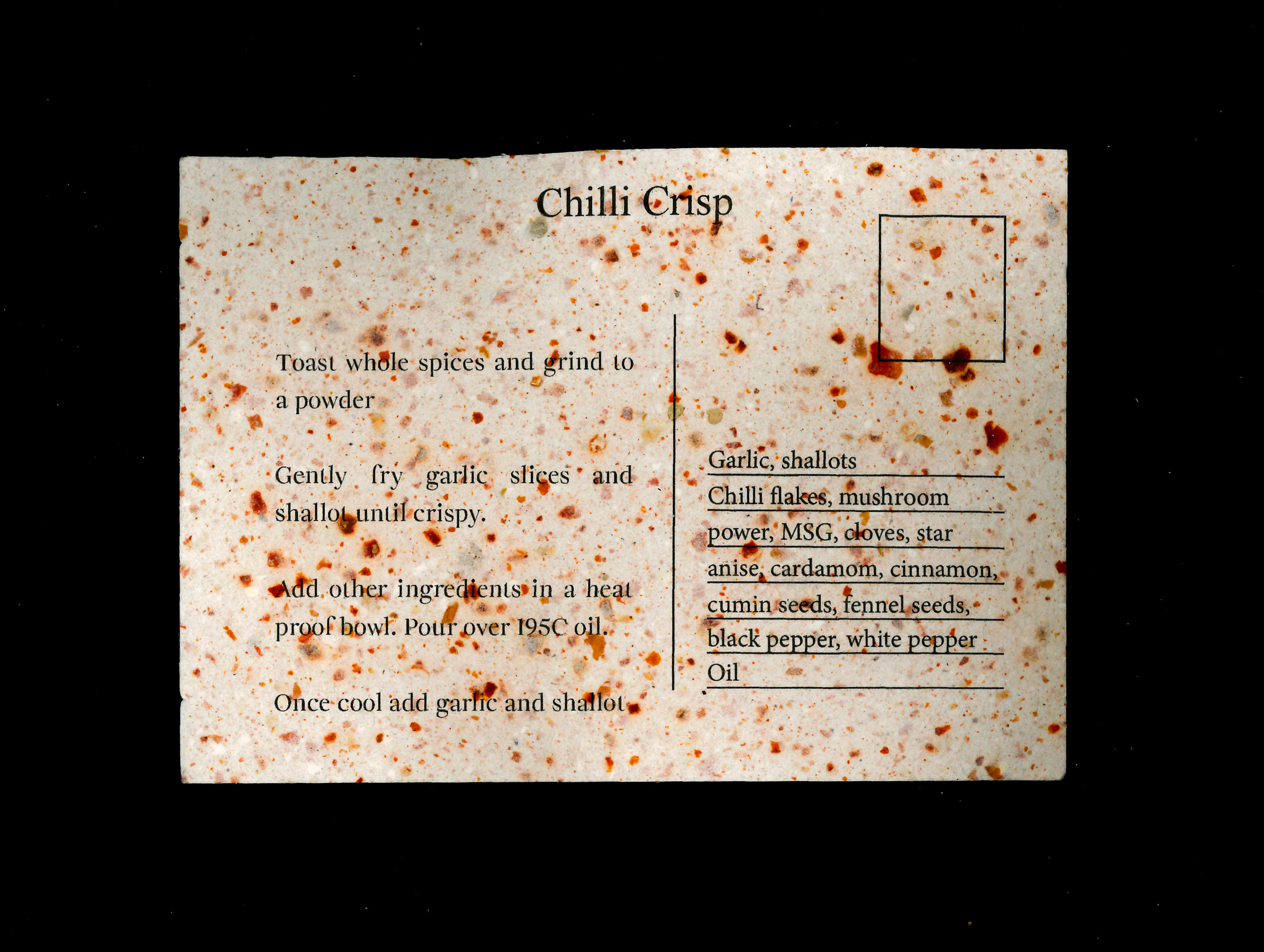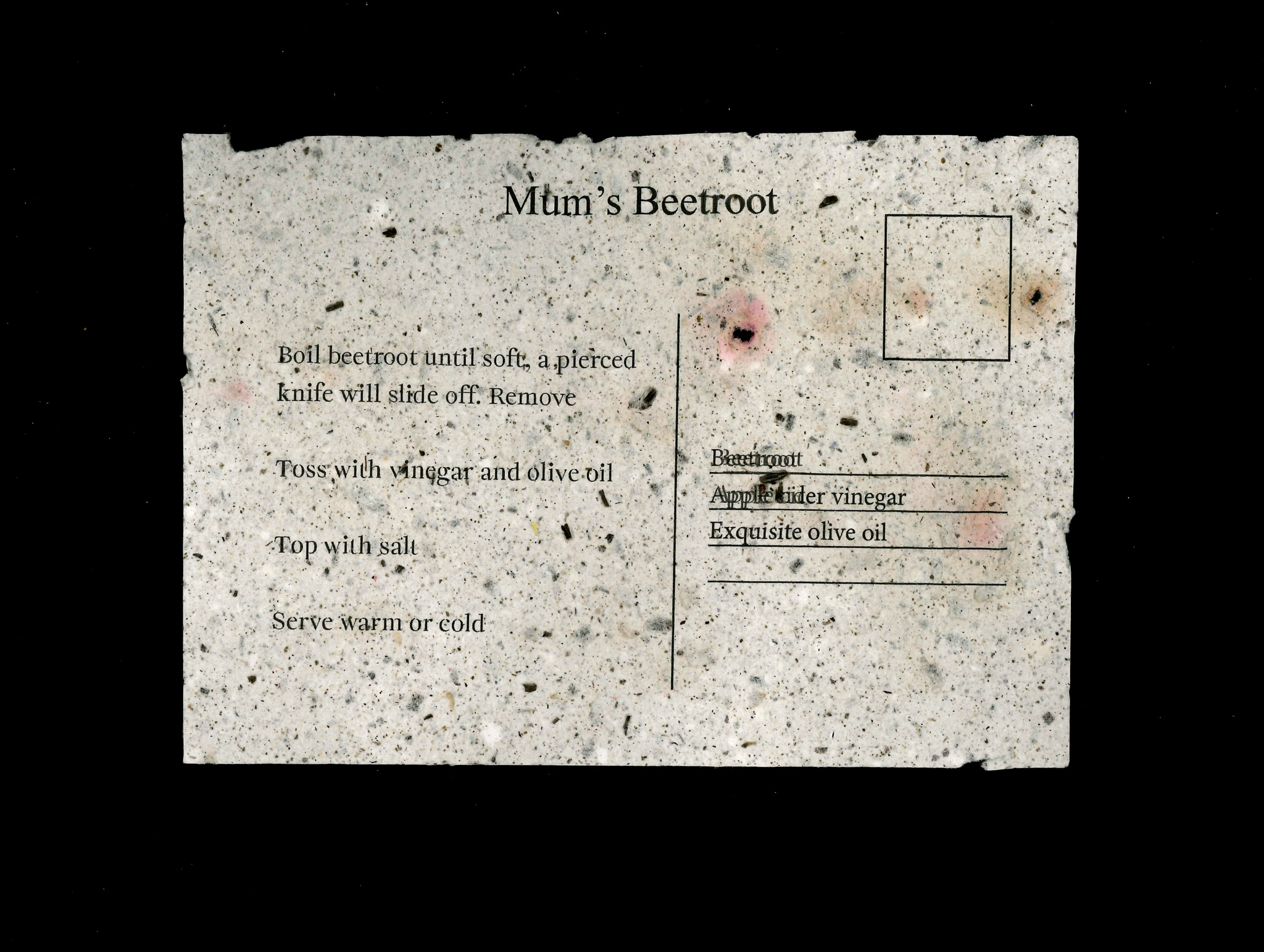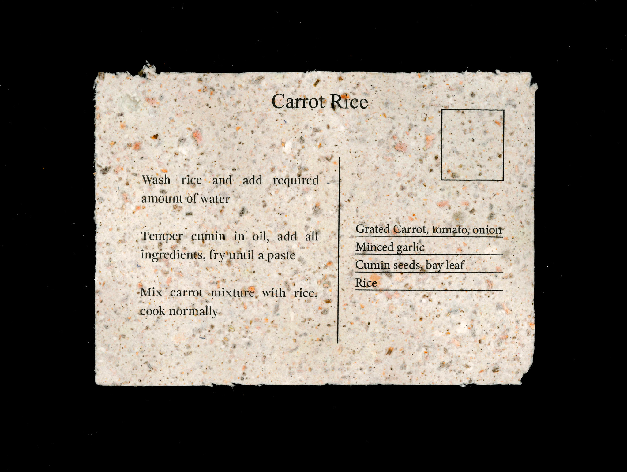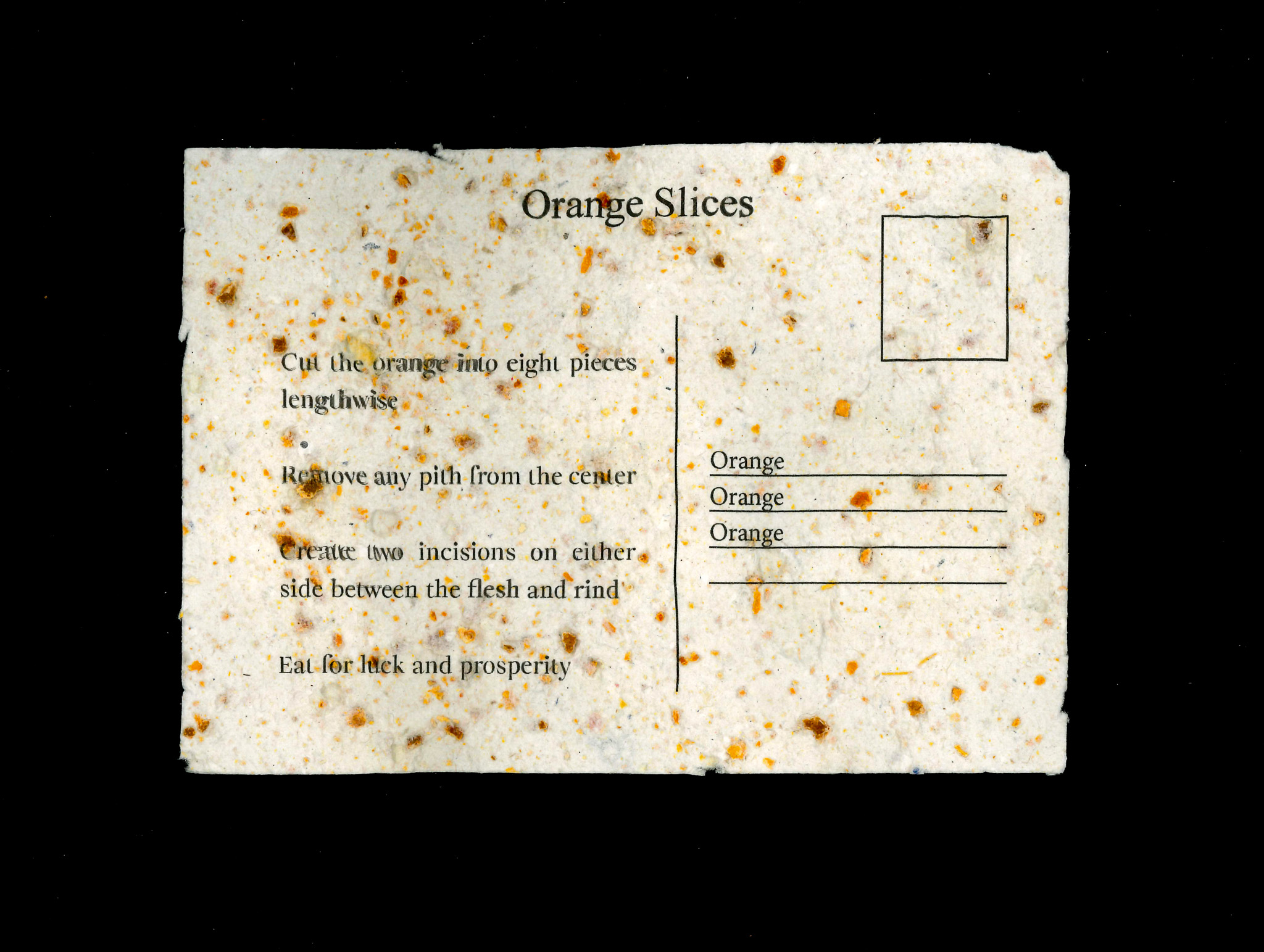 For when you can’t show someone how to make a dish where you must measure with your fingers and eyeball the sauces. Made with the main ingredient of each dish and a little love. These postcard recipes were created using the food waste from a summer of feasts, banquets, and gatherings.